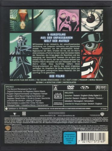 Willkommen in der Animatrix, der zukunftsweisenden Verbindung von Computer und japanischen Animés - inszeniert von den berühmtesten Regisseuren der Welt. Erleben sie mit, wie die Matrix einst entstand, erfahren sie mehr über die letzten Städte der Menschen, den Krieg gegen die Maschinen und den Untergang der Menschheit. Kommen sie an Bord zum Letzten Flug der Osiris, der den explosiven Auftakt zum Kinofilm Matrix Reloaded und zum Videospiel Enter the Matrix bildet. Diese Kurzfilme liefern Ihnen Hintergrundwissen zur Matrix, das sonst nirgendwo verfügbar ist. Erweitern Sie ihren Horizont durch das überwältigend umfangreiche Bonusmaterial: Die Zeit zum Plug-in ist gekommen.DIE FILME:DER LETZTE FLUG DER OSIRISTHE SECOND RENAISSANCE I + IIKID'S STORYPROGRAMWORLD RECORDBEYONDA DETECTIVE STORYMATRICULATED