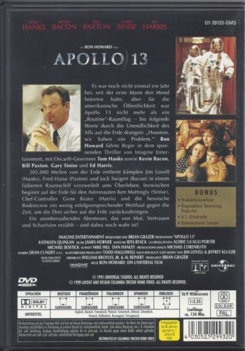 Es war noch nicht einmal ein Jahr her, seit der erste Mann den Mond betreten hatte, aber für die amerikanische Öffentlichkeit war Apollo 13 nicht mehr als ein "Routine"-Raumflug - bis folgende Worte durch die Unendlichkeit des Alls drangen: "Houston, wir haben ein Problem." Ron Howard führte Regie in dem spannenden Thriller von Imagine Entertainment mit Oscar-Gewinner Tom Hanks sowie Kevin Bacon, Bill Paxton, Gary Sinise und Ed Harris.205.000 Meilen von der Erde entfernt kämpfen Jim Lovell (Hanks), Fred Haise (Paxton) und Jack Swiggert (Bacon) in einem lädierten Raumschiff verzweifelt ums Überleben. Inzwischen beginnt auf der Erde für den Astronauten Ken Mattingly (Sinise), Chef-Controller Gene Kranz (Harris) und die heroische Bodencrew ein weing erfolgversprechender Wettlauf gegen die Zeit, um die drei sicher zur Erde zurückzubringen.Ein atemberaubendes Abenteuer, das von Mut, Vertrauen und Scharfsinn erzählt - und dabei noch wahr ist!