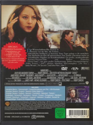 Die Wissenschaftlerin Ellie Arroway ist besessen von der Idee, die Existenz außerirdischer Intelligenz zu beweisen. Eines Tages gelingt es ihr tatsächlich, eine Nachricht aus dem All aufzuzeichnen: Eine fremde Lebensform macht ein verschlüsseltes Angebot zur Kontaktaufnahme! Ein großer, atemberaubender Science-Fiction-Film von Robert Zemeckis ("Forrest Gump"), mit ganz großer Starbesetzung: Neben Oscarpreisträgerin® (Jodie Foster) ("Nell") spielen Matthew McConaughey ("Die Jury"), James Woods ("The Specialist") und John Hurt ("Alien").