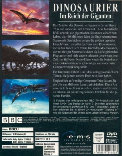 Das Zeitalter der Dinosaurier begann in der mittleren Trias und endete mit der Kreidezeit. Diese fantastische DVD erweckt die gigantischen Kreaturen wieder zum Leben, die 160 Millionen Jahre die Erde beherrschten. Spannende Geschichten zeigen die größten jagenden Fleischfresser, die pflanzenfressenden Riesensaurier, die in den Tiefen der Ozeane lauernden Meeressaurier, die mit riesiger Spannweite durch die Lüfte gleitenden Flugsaurier und viele andere seltsame Lebewesen jener Zeit. Im Stil bester Natur-Filme wurde die beeindruckende Dokumentation in aufwendiger und modernster Computertechnik hergestellt.Ein hautnahes Erlebnis mit den außergewöhnlichsten Tieren, die jemals unsere Erde bevölkert haben.Unglaublich aufwendige Computereffekte lassen Sie die Uhr um millionen Jahre zurückdrehen. Diese Ära unserer Erde nicht nur zu sehen, sondern realitätsnah zu erleben, ist ein unvergessliches Erlebnis für die gesamte Familie.Reisen Sie 220 Millionen Jahre zurück in die Vergangenheit, und erleben Sie in einer der aufwendigsten Dokumentationen der Fernsehgeschichte, wie die Dinosaurier der Urzeit wieder zum Leben erwachen. Die DVD beinhaltet die Folgen "Frisches Blut", "Die Zeit der Riesen" (Folge 1), "Eine grausame See", "Unter Flügeln von Riesen" (Folge 2) sowie "Die Geister der Eiswälder", "Untergang der Dynastie" (Folge 3) der beeindruckenden BBC-Serie "DINOSAURIER" (engl. Originaltitel: "Walking with Dinosaurs"). Ein Making-of (insgesamt ca. 24 Minuten) ist als wahlweises "Bild-im-Bild" erläuternd in die Filme eingebettet, d.h. es existieren 2 Varianten der Serie.