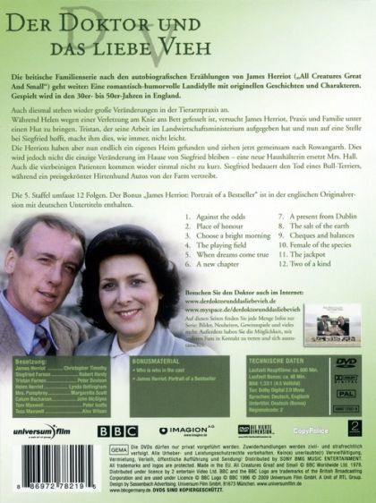Die britische Familienserie nach den autobiografischen Erzählungen von James Herriot („All Creatures Great And Small”) geht weiter: Eine romantisch-humorvolle Landidylle mit originellen Geschichten und Charakteren. Gespielt wird in den 30er- bis 50er-Jahren in England.Auch diesmal stehen wieder große Veränderungen in der Tierarztpraxis an.Während Helen wegen einer Verletzung am Knie ans Bett gefesselt ist, versucht James Herriot, Praxis und Familie unter einen Hut zu bringen. Tristan, der seine Arbeit im Landwirtschaftsministerium aufgegeben hat und nun auf eine Stelle bei Siegfried hofft, macht ihm dies, wie immer, nicht leicht.Die Herriots haben aber nun endlich ein eigenes Heim gefunden und ziehen jetzt gemeinsam nach Rowangarth. Dies wird jedoch nicht die einzige Veränderung im Hause von Siegfried bleiben - eine neue Haushälterin ersetzt Mrs. Hall. Auch die vierbeinigen Patienten kommen wieder einmal nicht zu kurz. Siegfried bedauert den Tod eines Bull-Terriers, während ein preisgekrönter Hirtenhund Autos von der Farm vertreibt.Die 5. Staffel umfasst 12 Folgen. Der Bonus „James Herriot: Portrait of a Bestseller” ist in der englischen Originalversion mit deutschen Untertiteln enthalten.DVD101. Against The Odds02. Place Of Honour03. Choose A Bright MorningDVD204. The Playing Field05. When Dreams Come True06. A New ChapterDVD307. A Present From Dublin08. The Salt Of The Earth 09. Cheques And BalancesDVD410. Female Of The Species11. The Jackpot12. Two Of A Kind