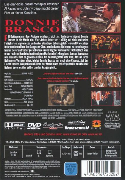 FBI-Spitzenmann Joe Pistone schleust sich als Undercover-Agent Donnie Brasco in die Mafia ein. Vier Jahre liefert er - völlig auf sich und seine Fähigkeiten angewiesen und unter ständiger Lebensgefahr - dem FBI wichtige Informationen über den Gangster-Clan, um die Bande für immer zu zerschlagen. Immer tiefer und tiefer gerät Donnie in den Sog der Kriminalität. Schließlich wird er zur rechten Hand des berüchtigten Mafioso Lefty Ruggiero, dessen Vertrauen und Freundschaft er gewinnen kann. Als den Gangstern klar wird, daß in ihren Reihen ein Verräter sitzt, bleibt Donnie Brasco nur noch eine Chance. Auf der Flucht vor den skrupellosen Killern der Mafia, muß er Lefty dem FBI ans Messer liefern, bevor es ihm selber an den Kragen geht...