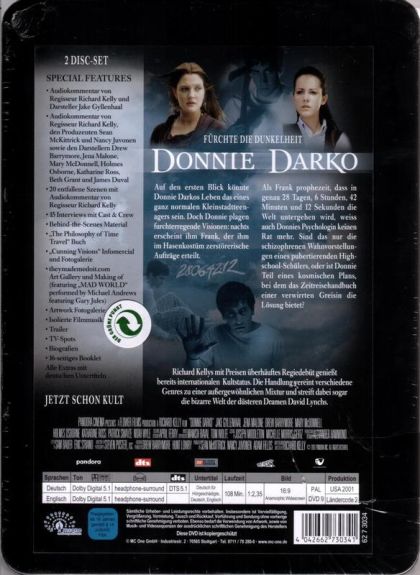 Auf den ersten Blick könnte Donnie Darkos Leben das eines ganz normalen Kleinstadtteenagers sein. Doch Donnie plagen furchterregende Visionen: nachts erscheint ihm Frank, der ihm im Hasenkostüm zerstörerische Aufträge erteilt.Als Frank prophezeit, dass in genau 28 Tagen, 6 Stunden, 42 Minuten und 12 Sekunden die Welt untergehen wird, weiss auch Donnies Psychologin keinen Rat mehr. Sind das nur die schizophrenen Wahnvorstellungen eines pubertierenden Highschool-Schülers, oder ist Donnie Teil eines kosmischen Plans, bei dem das Zeitreisehandbuch einer verwirrten Greisin die Lösung bietet?Richard Kellys mit Preisen überhäuftes Regiedebüt genießt bereits internationalen Kultstatus. Die Handlung vereint verschiedene Genres zu einer außergewöhnlichen Mixtur und streift dabei sogar die bizarre Welt der düsteren Dramen David Lynchs.