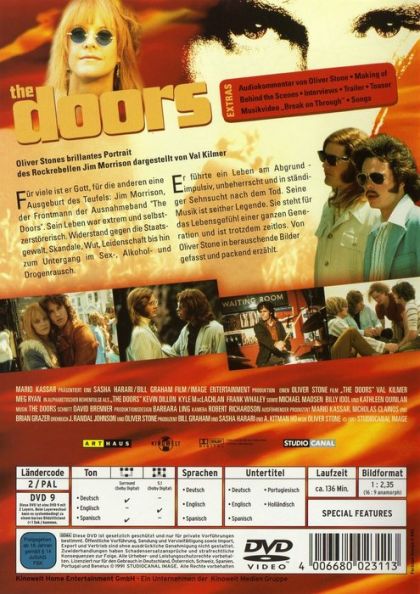 Für viele ist er Gott, für die anderen eine Ausgeburt des Teufels: Jim Morrison, der Frontmann der Ausnahmeband "The Doors". Sein Leben war extrem und selbstzerstörerisch. Widerstand gegen die Staatsgewalt, Skandale, Wut, Leidenschaft bis zum Untergang im Sex-, Alkohol,- und Drogenrausch.Er führte ein Leben am Abgrund - impulsiv, unbeherrscht und in ständiger Sehnsucht nach dem Tod. Seine Musik ist seither Legende. Sie steht für das Lebensgefühl einer ganzen Generation und ist trotzdem zeitlos. Von Oliver Stone in berauschende Bilder gefasst und packend erzählt.