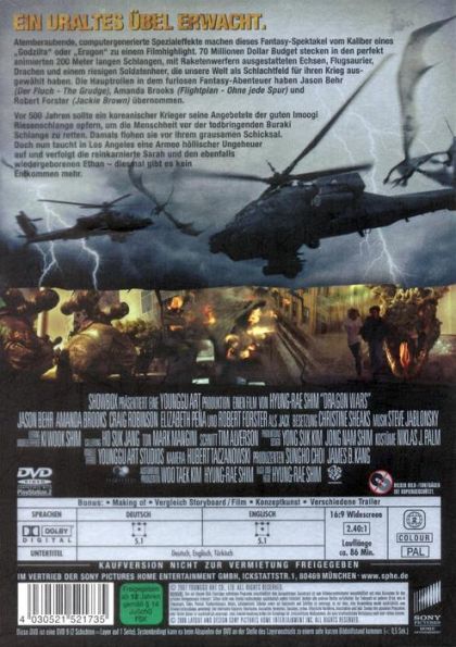 EIN URALTES ÜBEL ERWACHTAtemberaubende, computergenerierte Spezialeffekte machen dieses Fantasy-Spektakel vom Kaliber eines "Godzilla" oder "Eragon" zu einem Filmhighlight. 70 Millionen Dollar Budget stecken in den perfekt animierten 200 Meter langen Schlangen, mit Raketenwerfern ausgestatteten Echsen, Flugsaurier, Drachen und einem riesige Soldatenheer, die unsere Welt als Schlachtfeld für ihren Krieg ausgewählt haben. Die Hauptrollen in dem furiosen Fantasy Abenteuer haben Jason Behr (Der Fluch - The Grudge), Amanda Brooks (Flightplan - Ohne Jede Spur) und Robert Forster (Jackie Brown) übernommen.Vor 500 Jahren sollte ein koreanischer Krieger seine Angebetete der guten Imoogi Riesenschlange opfern, um die Menschheit vor der todbringenden Buraki Schlange zu retten. Damals flohen sie vor ihrem grausamen Schicksal. Doch nun taucht in Los Angeles eine Armee höllischer Ungeheuer auf und verfolgt die reinkarnierte Sarah und den ebenfalls wiedergeborenen Ethan - diesmal gibt es kein Entkommen mehr.