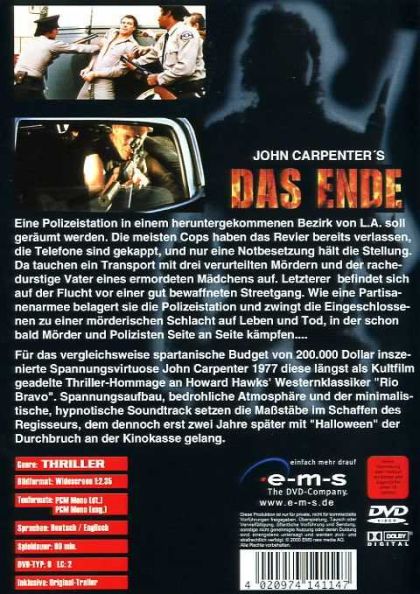 Eine Polizeistation in einem heruntergekommenen Bezirk von L.A. soll geräumt werden. Die meisten Cops haben das Revier bereits verlassen, die Telefone sind gekappt, und nur eine Notbesetzung hält die Stellung. Da tauchen ein Transport mit drei verurteilten Mördern und der rachedurstige Vater eines ermordeten Mädchens auf. Letzterer befindet sich auf der Flucht vor einer gut bewaffneten Streetgang. Wie eine Partisanenarmee belagert sie die Polizeistation und zwingt die Eingeschlossenen zu einer mörderischen Schlacht auf Leben und Tod, in der schon bald Mörder und Polizisten Seite an Seite kämpfen....Für das vergleichsweise spartanische Budget von 200.000 Dollar inszenierte Spannungsvirtuose John Carpenter 1977 diese längst als Kultfilm geadelte Thriller-Hommage an Howard Hawks' Westernklassiker "Rio Bravo". Spannungsaufbau, bedrohliche Atmosphäre und der minimalistische, hypnotische Soundtrack setzen die Maßstäbe im Schaffen des Regisseurs, dem dennoch erst zwei Jahre später mit "Halloween" der Durchbruch an der Kinokasse gelang.