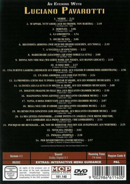 Tracklisting: 01 Nebbie 02 M'Appari, Tutt'Amor (Ach so fromm, von Martha) 03 Serenata 04 La Girometta 05 Occhi Di Fata 06 Recondita Armonia (Wie sich die Bilder gleichen, aus Tosca) 07 A Vuccella (D'Annunzio) 08 Marechiare (Giacomo) (Quando Sorge La Luna) 09 Donna Non Vidi Mai (Wo lebte wohl ein Wesen, Aus Manon Lescaut) 10 O Sole Mio 11 Una Furtive Lagrima (Heimlich aus ihrem Auge, aus L'elisir d'amore / Der Liebestrank) 12 Un Aura Amorosa (aus Cosi Van Tutte) 13 La Promessa (Ch'io mai vi Possa lasciar d'amare, aus Les Soirees Musicales) 14 La Danza (Gia la lune e in mezzo al mare, aus Les Soirees Musicales) 15 Dolente imagine di fille mia (aus Belcanto Chamber Music) 16 Malincolia Ninfa Gentile (aus Belcanto Chamber Music) 17 Vanna, O Rosa Fortunate (aus Belcanto Chamber Music) 18 Bella Nice Che D'Amore (aus Belcanto Chamber Music) 19 Ma Rendi Pur Concento (Gib Seelenruhe, aus Belcanto Chamber Music) 20 La Mia Letizia Infondere... (Come Poteva Un Angelo) (Nur meine Freunde, aus I Lombardi Alla Prima Crociata / Die Lombarden) 21 Pourquoi Me Reveiller... Ah, Non Mi Ridestar (Was bin ich aufgewacht, aus Werther) 22 Nevicata (Negri) 23 Pioggia (Pompiij) 24 Per Divertimento (instrumental)