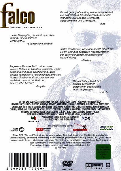 DiDas ist ganz großes Kino, zusammengebastelt aus schmierigen Trashelementen, aus einem Wahnsinn aus Drogen, Eifersucht, Selbstzweifeln und Grandezza,,, -kino...eine Biographie, die nicht das Leben imitiert, ist ein seltenes Vergnügen... -Süddeutsche Zeitung"Falco - Verdammt, wir leben noch!" glänzt mit einem grandios besetzten Hauptdarsteller, der österreichischen Neuentdeckung Manuel Rubey. -PlayboyRegisseur Thomas Roth nähert sich seinem Helden so handfest gradlinig, weder beschönigend noch glorifizierend, dass dessen komplizierte Persönlichkeit zwischen Muttersöhnchen und Kotzbrocken erst amüsiert, dann schockiert und zuletzt sehr berührt. -BrigitteManuel Rubey spielt den zutiefst zerrissenen Exzentriker glaubwürdig, intensiv, packend... -Hör Zu