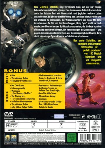 Im Jahre 2065: eine verwüstete Erde, auf der nur wenige Lebensformen existieren können. Eine Invasion von Außerirdischen droht auch den letzten Rest der Menschheit und jegliches weitere Leben auszulöschen. Es gibt nur eine Hoffnung, das Schicksal aller zu retten und die Eroberer zu eliminieren: die Wissenschaftlerin Aki Ross. Mit Hilfe ihres Mentors Dr. Sid und der Kampftruppe "Deep Eyes" sucht sie nach den letzten Überresten der Schlüsselkomponenten, die die Erde vor dem Untergang bewahren könnten. Ein Rennen gegen die Zeit beginnt - und gegen den militanten General Hein, der die einzig mögliche Chance darin sieht, eine riesige Space-Kanone auf die Feinde abzufeuern.Der erste Spielfilm, der komplett am Computer entstanden ist - perfekt produziert von 150 Digitalkünstlern und 20 Computeranimateuren.