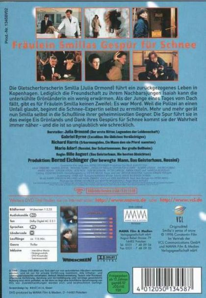 Die Gletscherforscherin Smilla (Julia Ormond) führt ein zurückgezogenes Leben in Kopenhagen.Lediglich die Freundschaft zu ihrem Nachbarsjungen Isaiah kann die unterkühlte Grönländerin ein wenig erwärmen. Als der Junge eines Tages vom Dach fällt, gibt es für Fräulein Smilla keinen Zweifel: Es war Mord. Weil die Polizei an einen Unfall glaubt, beginnt die Schnee-Expertin selbst zu ermitteln. Mehr und mehr gerät nun Smilla selbst in die Schußlinie ihrer geheimnisvollen Gegner. Die Spur führt sie in das ewige Eis Grönlands und Dank ihres Gespürs für Schnee kommt sie der Wahrheit immer näher - und die ist so unglaublich wie schrecklich.