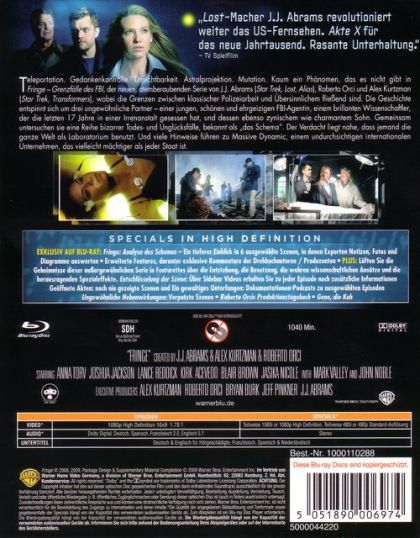 Episoden:-----Disc 1------1x01 Flug 627 (Teil 1 & 2)-1x02 Das Experiment-1x03 Roy-1x04 Die Ankunft-----Disc 2------1x05 Unter Strom-1x06 Das Heilmittel-1x07 Der geheimnisvolle Mr. Jones-1x08 Die Gleichung-----Disc 3------1x09 Schmetterlinge im Kopf -1x10 Durch die Wand-1x11 Das Schnupfenvirus -1x12 Hirnfresser-----Disc 4------1x13 Conrad -1x14 Das Manifest-1x15 Ohne Worte-1x16 Entfesselt-----Disc 5------1x17 Alpträume-1x18 Nachtschatten-1x19 Der andere Weg-1x20 Nichts ist einzigartigInhaltsangabe:Teleportation. Gedankenkontrolle. Unsichtbarkeit. Astralprojektion. Mutation. Kaum ein Phänomen, das es nicht gibt in Fringe - Grenzfälle des FBI. der neuen, atemberaubenden Serie von J.J. Abrams (Star Trek, Lost, Alias), Roberto Orci und Alex Kurtzman (Star Trek, Transformers), wobei die Grenzen zwischen klassischer Polizeiarbeit und Übersinnlichen fließend sind. Die Geschichte entspinnt sich um drei ungewöhnliche Partner - einer jungen, schönen und ergeizigen FBI-Agentin, einem brillanten Wissenschaftler, der die letzten 17 Jahre in einer Irrenanstalt gesessen hat, und dessen ebenso zynischem wie charmanten Sohn. Gemeinsam untersuchen sie eine Reihe bizarrer Todes- und Unglücksfälle, bekannt als "das Schema". Der Verdacht liegt nahe, dass jemand die ganze Welt als Laboratorium benutzt. Und viele Hinweise führen zu Massive Dynamic, einem undurchsichtigen internationalen Unternehmen, das vielleicht mächtiger als jeder Staat ist.