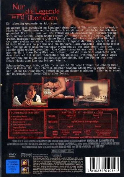 Mehr als 100 Jahre nach seinen unbegreiflichen Bluttaten ist die Faszination für Jack the Ripper ungebrochen. Die Brüder Albert und Allen Hughes (Menace Il Society, Dead Presidents) haben sich der bis heute unaufgeklärten Mordserie angenommen und präsentieren nun den realen Kriminalfall als atemberaubenden Thriller. Nach Motiven des gleichnamigen Comicromans von Alan Moore und Eddie Campbell drehte das Brüderpaar einen Film über Finsternis, Wahnsinn, Obsession und eine Verschwörung, die bis in die höchsten Kreise führt. Unterstützt von einer exquisiten Starriege, angeführt von Johnny Depp (Sleepy Hollow), Heather Graham (Austin Powers 2, Ohne Worte), Ian Holm (Der Herr Der Ringe) und Robbie Coltrane (Harry Potter), haben die Hughes-Brüder eines der dunkelsten Kapitel der Kriminalgeschichte spektakulär, spannend, detailgenau und intelligent zum Leben erweckt.London, 1888. Eine Serie mysteriöser Morde an Prostituierten versetzt das Londoner Armenviertel Whitechapel in Angst und Schrecken. Der Mörder nennt sich Jack the Ripper, er mordet lautlos, unerkannt und ungesehen. Inspektor Abberline (Johnny Depp) und sein Assistent Godley (Robbie Coltrane) werden mit der Klärung des Falles beauftragt, der längst auch die feine Gesellschaft beunruhigt. Abberlines unkonventionelle Vorgehensweise führt ihn bald zur Erkenntnis, dass der Wahnsinnige mit Methode mordet. Seine Opfer stammen alle aus dem Freundeskreis der irischen Prostituierten Mary Kelly (Heather Graham). Und diese Frauen hüten ein gefährliches Geheimnis, das das gesamte Königreich zum Einsturz bringen könnte …