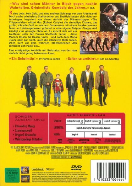 Keine Jobs, kein Geld, und eine endlose Schlange vor dem Arbeitsamt! Doch sechs arbeitslose Stahlarbeiter aus Sheffield lassen sich nicht unterkriegen. Inspiriert von einem Auftritt der Männerstripper "The Chippendales" wittert Gaz (Robert Carlyle) die einmalige Chance, das große, schnelle Geld zu machen. Gemeinsam mit einem handverlesenen Team von Leidensgenossen gründet er eine eigene Stripper-Truppe und kündigt eine gewagte Show an. Es spricht sich wie ein Lauffeuer unter den Frauen Sheffields herum - diese Männer lassen die Hosen runter - und nach dem Motto "Ganz oder gar nicht" auch die allerletzte Hülle fallen. Doch kurz vor dem wahrlich bloßstellenden Job schleicht sich den Männern Panik ein ...Eine einzigartige Komödie mit Kultstatus, von der man einfach nicht genug bekommen kann.