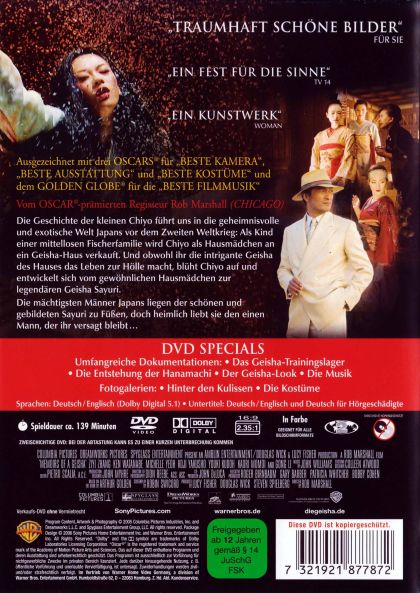 Die Geschichte der kleinen Chiyo führt uns in die geheimnisvolle und exotische Welt Japans vor dem Zweiten Weltkrieg: Als Kind einer mittellosen Fischerfamilie wird Chiyo als Hausmädchen an ein Geisha-Haus verkauft. Und obwohl ihr die intrigante Geisha des Hauses das Leben zur Hölle macht, blüht Chiyo auf und entwickelt sich vom gewöhnlichen Hausmädchen zur legendären Geisha Sayuri.Die mächtigsten Männer Japans liegen der schönen und gebildeten Sayuri zu Füßen, doch heimlich liebt sie den einen Mann, der ihr versagt bleibt...