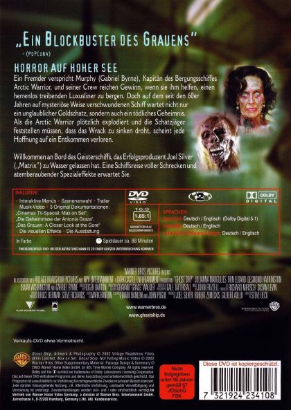 Ein Fremder verspricht Murphy (Gabriel Byrne), Kapitän des Bergungsschiffes Arctic Warrior, und seiner Crew reichen Gewinn, wenn sie ihm helfen, einen herrenlos treibenden Luxusliner zu bergen. Doch auf dem seit den 60er Jahren auf mysteriöse Weise verschwundenen Schiff wartet nicht nur ein unglaublicher Goldschatz, sondern auch ein tödliches Geheimnis. Als die Arctic Warrior plötzlich explodiert und die Schatzjäger feststellen müssen, dass das Wrack zu sinken droht, scheint jede Hoffnung auf ein Entkommen verloren.Willkommen an Bord des Geisterschiffs, das Erfolgsproduzent Joel Silver ("Matrix") zu Wasser gelassen hat. Eine Schiffsreise voller Schrecken und atemberaubender Spezialeffekte erwartet Sie.