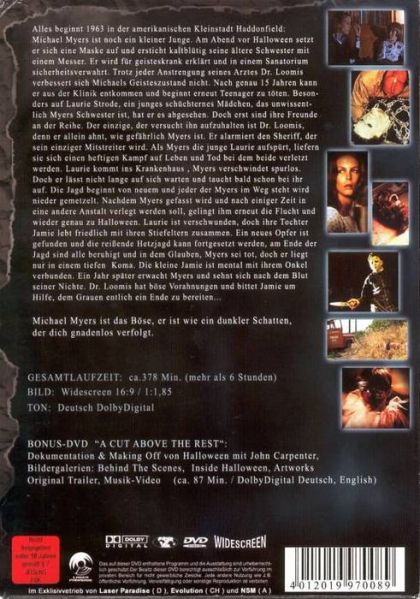 Halloween: Die Nacht des GrauensIm zarten Kindesalter ermordet der kleine Michael Myers seine Schwester mitten in der Halloween Nacht kaltblütig. Daraufhin wird er in eine geschlossene Anstalt eingewiesen. Fünfzehn Jahre später schafft er es, aus der Anstalt zu fliehen. Er kehrt, von seinem Psyhiater Dr.Loomis verfolgt, in seine Heimatstadt Haddonfield zurück. Unerkannt lauert er in der nächsten Halloween Nacht Jugendlichen auf, um sie zu töten. Besonders die unscheinbare Babysitterin Laurie muß um ihr Leben fürchten.Halloween 2: Das Grauen kehrt zurückObwohl Dr. Loomis mehrfach auf den wahnsinnigen Michael Myers gefeuert hat, schafft es der Killer doch, auf mysteriöse Weise zu entkommen. Die junge Laurie Strode wird mit einem Schock erst einmal in ein Krankenhaus eingeliefert. Doch der wahre Horror fängt jetzt erst an, denn Michael Myers verfolgt Laurie fanatisch weiter und tötet jeden, der sich ihm in den Weg stellt. Die Nacht des Grauens erreicht ihren blutigen Höhepunkt. Halloween 4: Michael Myers kehrt zurückMichael Myers, der Haddonfield-Killer aus den ersten beiden Halloween-Filmen, entkommt während einer Überführung in eine andere psychiatrische Anstalt und macht sich auf den Weg, seine siebenjährige Nichte Jamie umzubringen, die nach dem Tod ihrer Eltern von einem Ehepaar adoptiert wurde. Dr. Loomis ist dem Killer wieder auf den Fersen, doch er kann nicht verhindern, daß Myers eine Spur von Leichen hinter sich zurückläßt, da man ihn permanent unterschätzt. Halloween 5:Ein Jahr ist vergangen, seit Michael Myers angeblich ausgeschaltet wurde. Seine Nichte Jamie hält sich seit ihrem Messerangriff auf ihre Stiefmutter in einer Kinderpsychiatrie auf und hat seither kein Wort mehr gesprochen. ... Halloween: A Cut Above the Rest:John Carpenters HALLOWEEN gehört zu den bekanntesten Filmklassikern. Genauso spannend wie der Film selbst ist auch seine Entstehung. Regisseur, Darsteller und Produzenten erzählen, wie mit wenigen Mitteln und viel Enthusiasmus der Klassiker des modernen Horrorfilms entstand. WIE DIE NACHT DES GRAUENS ENTSTAND: Die Dokumentation zum Klassiker... 1978 erschien in den Kinos ein aussergewöhnlicher Horror-Thriller, der wie kaum ein anderer das Genre beeinflusste.