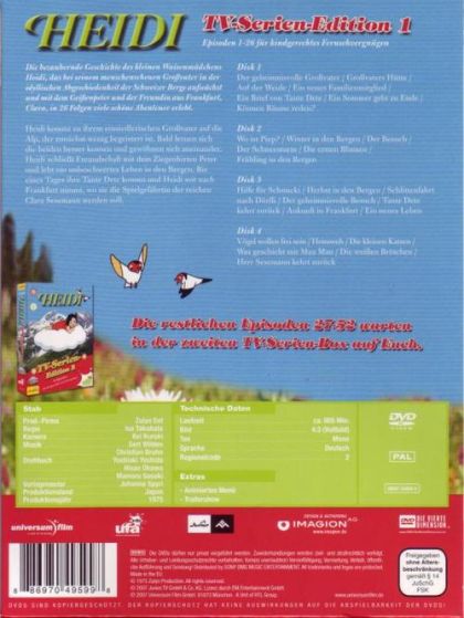 Die bezaubernde Geschichte des kleinen Waisenmädchens Heidi, das bei seinem menschenscheuen Großvater in der idyllischen Abgeschiedenheit der Schweizer Berge aufwächst und mit dem Geißenpeter und der Freundin aus Frankfurt, Clara, in 26 Folgen viele schöne Abenteuer erlebt.Heidi kommt zu ihrem einsiedlerischen Großvater auf die Alp, der zunächst wenig begeistert ist. Bald lernen sich die beiden besser kennen und gewöhnen sich aneinander. Heidi schließt Freundschaft mit dem Ziegenhirten Peter und lebt ein unbeschwertes Leben in den Bergen. Bis eines Tages ihre Tante Dete kommt und Heidi mit nach Frankfurt nimmt, wo sie die Spielgefährtin der reichen Clara Sesemann werden soll.Disk 1Der geheimnisvolle Großvater / Großvaters Hütte / Auf der Weide / Ein neues Familienmitglied / Ein Brief von Tante Dete / Ein Sommer geht zu Ende / Können Bäume reden?Disk 2Wo ist Piep? / Winter in den Bergen / Der Besuch / Der Schneesturm / Die ersten Blumen / Frühling in den BergenDisk 3Hilfe für Schnucki / Herbst in den Bergen / Schlittenfahrt nach Dörfli / Der geheimnisvolle Besuch / Tante Dete kehrt zurück / Ankunft in Frankfurt / ein neues LebenDisk 4Vögel wollen frei sien / Heimweh / Die kleine Katzen / Was geschieht mit Mau Mau / Die weißen Brötchen / Herr Sesemann kehrt zurück