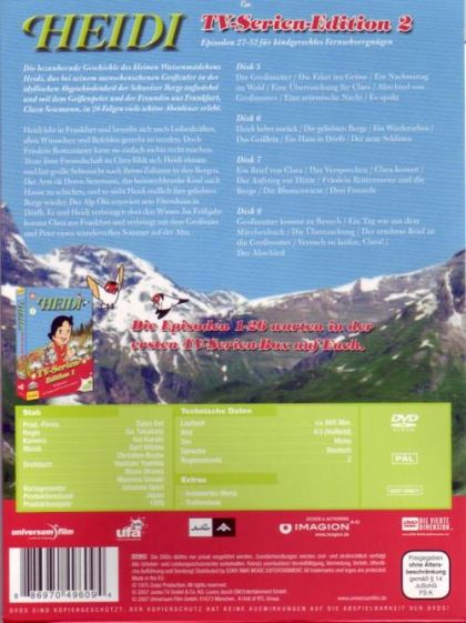 Die bezaubernde Geschichte des kleinen Waisenmädchens Heidi, das bei seinem menschenscheuen Großvater in der idyllischen Abgeschiedenheit der Schweizer Berge aufwächst und mit dem Geißenpeter und der Freundin aus Frankfurt, Clara Sesemann, in 26 Folgen viele schöne Abenteuer erlebt.Heidi lebt in Frankfurt und bemüht sich nach Leibeskräften, allen Wünschen und Befehlen gerecht zu werden. Doch Fräulein Rottenmeier kann sie einfach nichts recht machen. Trotz ihrer Freundschaft zu Clara fühlt sich Heidi einsam und hat große Sehnsucht nach ihrem Zuhause in den Bergen. Der Arzt rät Herrn Sesemann, das heimwehkranke Kind nach Hause zu schicken, und so sieht Heidi endlich ihre geliebten Berge wieder. Der Alp Öhi renoviert sein Elternhaus in Dörfli. Er und Heidi verbringen dort den Winter. Im Frühjahr kommt Clara aus Frankfurt und verbringt mit dem Großvater und Peter einen wundervollen Sommer auf der Alm.Disk 5Die Großmutter / Die Fahrt ins Güne / Ein Nachmittag im Wald / Eine Überraschung für Clara / Abschied von Großmutter / Eine stürmische Nacht / Es spucktDisk 6Heidi kehrt zurück / Die geliebten Berge / Ein Wiedersehen / Das Geißlein / Ein Haus in Dörfli / Der neue SchlittenDisk 7Ein Brief von Clara / Das Versprechen / Clara kommt / Der Aufstieg zur Hütte / Fräulein Rottenmeier und die Berge / Die Blumenwiese / Drei FreundeDisk 8Großmutter kommt zu Besuch / Ein Tag wie aus dem Märchenbuch / Die Überraschung / Der ersehnte Brief an die Großmutter / Versuch zu laufen, Clara! / Der Abschied