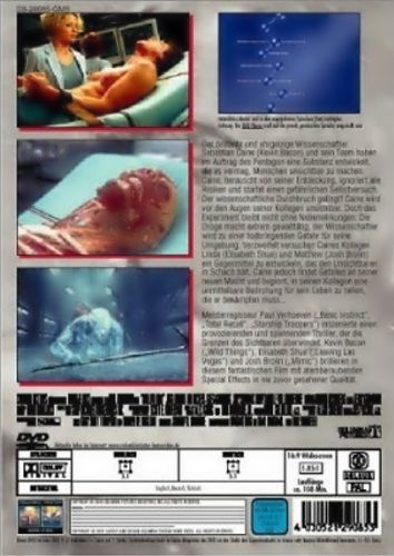 Der brilliante und ehrgeizige Wissenschaftler Sebastian Caine (Kevin Bacon) und sein Team haben im Auftrag des Pentagon eine Substanz entwickelt, die es vermag, Menschen unsichtbar zu machen. Caine, berauscht von seiner Entdeckung, ignoriert alle Risiken und startet einen gefährlichen Selbstversuch. Der wissenschaftliche Durchbruch gelingt! Caine wird vor den Augen seiner Kollegen unsichtbar. Doch das Experiment bleibt nicht ohne Nebenwirkungen: Die Droge macht extrem gewalttätig, der Wissenschaftler wird zu einer todbringenden Gefahr für seine Umgebung. Verzweifelt versuchen Caines Kollegen Linda (Elisabeth Shue) und Matthew (Josh Brolin) ein Gegenmittel zu entwickeln, das den Unsichtbaren in Schach hält. Caine jedoch findet Gefallen an seiner neuen Macht und beginnt, in seinen Kollegen eine unmittelbare Bedrohung für sein Leben zu sehen, die er bekämpfen muss...Meisterregisseur Paul Verhoeven („Basic Instinct“, „Total Recall“, „Starship Troopers“) inszenierte einen provozierenden und spannenden Thriller, der die Grenzen des Sichtbaren überwindet. Kevin Bacon („Wild Things“), Elisabeth Shue („Leaving Las Vegas“) und Josh Brolin („Mimic“) brillieren in diesem fantastischen Film mit atemberaubenden Special Effects in nie zuvor gesehener Qualität.