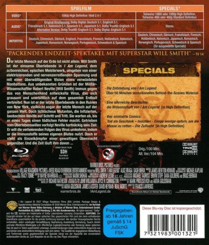 Der letzte Mensch auf der Erde ist nicht allein. Will Smith ist der einsame Überlebende in I Am Legend, dem actionreichen, epischen Meisterwerk, umgeben von einer elektrisierenden und nervenzerreißenden Spannung und mit einer überwältigenden Vision eines verwüsteten Manhattans. Aus unbekannten Gründen ist der Militär-Wissenschaftler Robert Neville (Will Smith) immun gegen das von Menschenhand entwickelte Virus, das sich grausam und unerbittlich auf dem gesamten Erdball verbreitet. Nun ist er der letzte Überlebende in den Ruinen von New York, vielleicht sogar der letzte Mensch auf der ganzen Welt. Doch lichtscheue Mutanten, die Infizierten, beobachten Neville auf Schritt und Tritt. Sie warten ab, bis er eines Tages einen tödlichen Fehler macht. Getrieben vom Überlebenswillen verfolgt Neville hartnäckig sein Ziel: Er will die verheerenden Folgen des Virus umkehren, indem er die Immunstoffe seines eigenen Blutes nutzt. Doch er steht als Einzelkämpfer einer gewaltigen Übermacht gegenüber. Und die Zeit läuft ihm davon ...