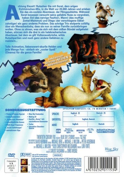 Achtung Eiszeit! Rutschen Sie mit Scrat, dem urigen Eichhörnchen-Mix, in die Welt vor 20.000 Jahren und erleben Sie das eis-coolste Abenteuer, der Filmgeschichte. Während Scrat besessen versucht seine geliebte Nuss zu vergraben haben Sid (das nervige Faultier), Manni (das muffige Zottel-Mammut) und Diego (der verschlagene Säbelzahntiger) ein ganz anderes Problem. Das schräge Trio stolpert zufällig über ein Menschenbaby, dass sie nun zu seiner Familie zurückbringen wollen. Ohne zu ahnen, was sie sich mit dem süßen Bündel aufgehalst haben, stürzen sich die drei in ein halsbrecherisches Abenteuer, bei dem es gilt Vulkanausbrüche, wilde Rutschpartien und noch ganz andere Gefahren zu meistern...Tolle Animation, liebenswert-skurile Helden und jede Menge Fun - einfach ein "cooler Spaß" (Cinema) für die ganze Familie!
