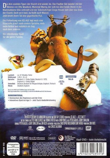 Die drei coolsten Typen der Eiszeit sind wieder da. Das Faultier Sid (wieder mit der Stimme von Otto Waalkes), Mammut Manny, der sich bis über beide Ohren in die Mammutdame Ellie verknallt und der Säbelzahntiger Diego freuen sich über das Ende der Eiszeit. Doch wo's taut, da fließt auch Wasser. Jetzt droht ihrem Tal eine gigantische Flut.Die Fortsetzung von ICE AGE legt noch eine Eisscholle drauf: noch coolere Sprüche, noch mehr Action und natürlich ein Gag nach dem anderen.Ein mitreißender Spaß für die ganze Familie.