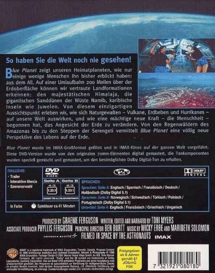 Blue Planet zeigt unseren Heimatplaneten, wie nur einige wenige Menschen ihn bisher erblickt haben: aus dem All. Auf einer Umlaufbahn 200 Meilen über der Erdoberfläche können wir vertraute Landformationen erkennen: den majestätischen Himalaja, die gigantischen Sanddünen der Wüste Namib, karibische Inseln wie Juwelen. Von diesem einzigartigen Aussichtspunkt erleben wir, wie sich Naturgewalten - Vulkane, Erdbeben und Hurrikanes - auf unsere Welt auswirken, und wie eine mächtige neue Kraft - die Menschheit - begonnen hat, das Angesicht der Erde zu verändern. Von den Regenwäldern des Amazonas bis zu den Steppen der Serengeti vermittelt Blue Planet eine völlig neue Perspektive des Lebens auf der Erde.