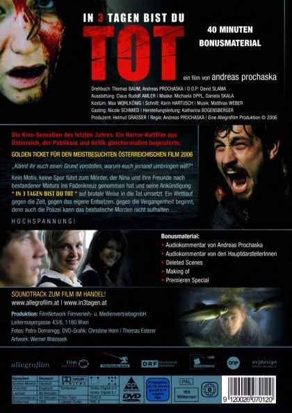 "Könnt ihr euch einen Grund vorstellen, warum euch jemand umbringen will?"Kein Motiv, keine Spur führt zum Mörder, der Nina und ihre Freunde nach bestandener Matura ins Fadenkreuz genommen hat und seine Ankündigung * IN 3 TAGEN BIST DU TOT * auf brutale Weise in die Tat umsetzt. Ein Wettlauf gegen die Zeit, gegen das eigene Entsetzen, gegen die Vergangenheit beginnt, denn auch die Polizei kann das bestialische Morden nicht aufhalten ...