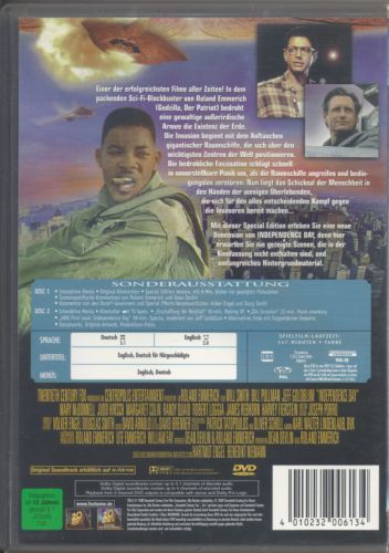 Einer der erfolgreichsten Filme aller Zeiten! In dem packenden Sci-Fi-Blockbuster von Roland Emmerich (Godzilla, Der Patriot) bedroht eine gewaltige außerirdische Armee die Existenz der Erde. Die Invasion beginnt mit dem Auftauchen gigantischer Raumschiffe, die sich über den wichtigsten Zentren der Welt positionieren. Die bedrohliche Faszination schlägt schnell in unvorstellbare Panik um, als die Raumschiffe angreifen und bedingungslos zerstören. Nun liegt das Schicksal der Menschheit in den Händen der wenigen Überlebenden, die sich für den alles entscheidenden Kampf gegen die Invasoren bereit machen...Mit dieser Special Edition erleben Sie eine neue Dimension von INDEPENDENCE DAY, denn hier erwarten Sie nie gezeigte Szenen, die in der Kinofassung nicht enthalten sind, und umfangreiches Hintergrundmaterial.