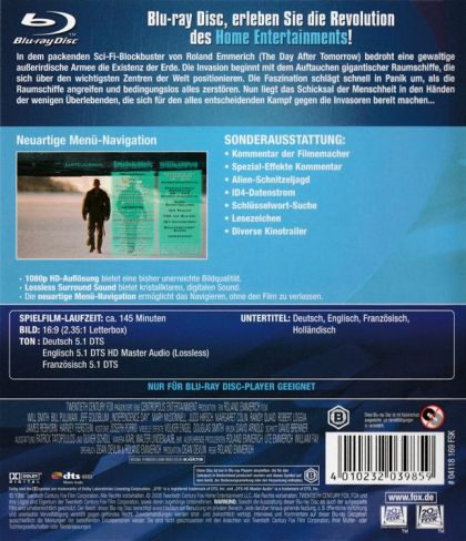In dem packenden Sci-Fi-Blockbuster von Roland Emmerich (The Day After Tomorrow) bedroht eine gewaltige außerirdische Armee die Existenz der Erde. Die Invasion beginnt mit dem Auftauchen gigantischer Raumschiffe, die sich über den wichtigsten Zentren der Welt positionieren. Die Faszination schlägt schnell in Panik um, als die Raumschiffe angreifen und bedingungslos alles zerstören. Nun liegt das Schicksal der Menschheit in den Händen der wenigen Überlebenden, die sich für den alles entscheidenden Kampf gegen die Invasoren bereit machen...