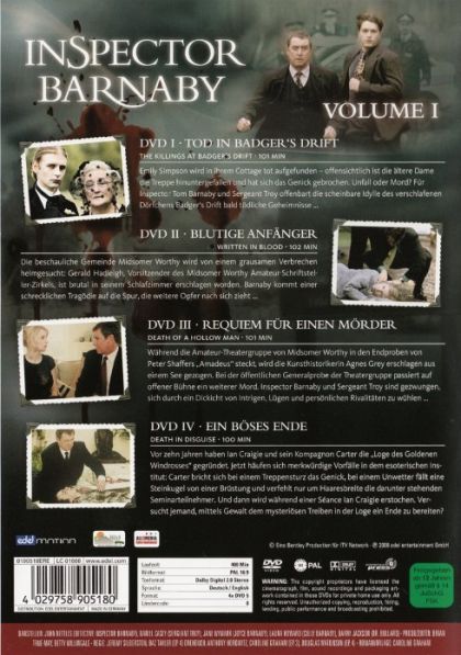 DVD I • TOD IN BADGER'S DRIFTThe Killings at Badger's Drift • 101 minEmily Simpson wird in ihrem Cottage tot aufgefunden - offensichtlich ist die ältere Dame die Treppe hinuntergefallen und hat sich das Genick gebrochen. Unfall oder Mord? Für Inspector Barnaby und Sergeant Troy offenbart die scheinbare Idylle des verschlafenen Dörfchens Badger's Drift bald tödliche Geheimnisse...DVD II • BLUTIGE ANFÄNGERWritten in Blood • 102 minDie beschauliche Gemeinde Midsomer Worthy wird von einem grausamen Verbrechen heimgesucht: Gerald Hadleigh, Vorsitzender des Midsomer Worthy Amateur-Schriftsteller-Zirkels, ist brutal in seinem Schlafzimmer erschlagen worden. Barnaby kommt einer schrecklichen Tragödie auf die Spur, die weitere Opfer nach sich zieht...DVD III • REQUIEM FÜR EINEN MÖRDERDeath of a Hollow Man • 101 minWährend die Amateur-Theatergruppe von Midsomer Worthy in den Endproben von Peter Shaffers "Amadeus" steckt, wird die Kunsthistorikerin Agnes Grey erschlagen aus einem See gezogen. Bei der öffentlichen Generalprobe der Theatergruppe passiert auf offener Bühne ein weiterer Mord. Inspector Barnaby und Sergeant Troy sind gezwungen, sich durch ein Dickicht von Intrigen, Lügen und persönlichen Rivalitäten zu wühlen...DVD IV • EIN BÖSES ENDEDeath in Disguise • 100 minVor zehn Jahren haben Ian Craigie und sein Kompagnon Carter die "Loge des Goldenen Windrosses" gegründet. Jetzt häufen sich merkwürdige Vorfälle in dem esoterischen Institut: Carter bricht sich bei einem Treppensturz das Genick, bei einem Unwetter fällt eine Steinkugel von einer Brüstung und verfehlt nur um Haaresbreite die darunter stehenden Seminarteilnehmer. Und dann wird während einer Séance Ian Craigie erstochen. Versucht jemand, mittels Gewalt dem mysteriösen Treiben in der Loge ein Ende zu bereiten?
