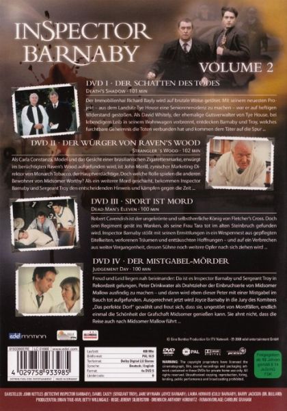DVD I • DER SCHATTEN DES TODESDeath's Shadow • 101 minDer Immobilienhai Richard Bayly wird auf brutale Weise getötet. Mit seinem neuesten Projekt - aus dem Landsitz Tye House eine Seniorenresidenz zu machen - war er auf heftigen Widerstand gestoßen. Als David Whitely, der ehemalige Gutsverwalter von Tye House, bei lebendigen Leib in seinem Wohnwagen verbrennt, entdecken Barnaby und Troy, welches furchtbare Geheimnis die Toten verbunden hat und kommen dem Täter auf die Spur...DVD II • DER WÜRGER VON RAVEN'S WOODStrangler's Wood • 102 minAls Carla Constanza, Model und Gesicht einer brasilianischen Zigarettenmarke, erwürgt im berüchtigten Raven's Wood aufgefunden wird, ist John Merill, zynischer Marketing-Direktor von Monarch Tobacco, der Hauptverdächtige. Doch welche Rolle spielen die anderen Bewohner von Midsomer Worthy? Als ein weiterer Mord geschieht, bekommen Inspector Barnaby und Sergeant Troy den entscheidenden Hinweis und kämpfen gegen die Zeit...DVD III • SPORT IST MORDDead Man's Eleven • 100 minRobert Cavendish ist der ungekrönte und selbstherrliche König von Fletcher's Cross. Doch sein Regiment gerät ins Wanken, als seine Frau Tara tot im alten Steinbruch gefunden wird. Inspector Barnaby stößt mit seinen Ermittlungen in ein Wespennest aus gepflegten Eitelkeiten, verlorenen Träumen und enttäuschten Hoffnungen - und auf ein Verbrechen aus weiter Vergangenheit, dessen Sühne noch weitere Opfer nach sich ziehen wird...DVD IV • DER MISTGABEL-MÖRDERJudgement Day • 100 minFreud und Leid liegen nah beieinander: Da ist es Inspector Barnaby und Sergeant Troy in Rekordzeit gelungen, Peter Drinkwater als Drahtzieher der Einbruchserie von Midsomer Mallow ausfindig zu machen - und dann wird eben dieser Peter mit einer Mistgabel im Bauch tot aufgefunden. Ausgerechnet jetzt wird Joyce Barnaby in die Jury des Komitees "Das perfekte Dorf" gewählt und freut sich, dass sie, ungestört von Mordfällen, endlich einmal die Schönheit der Grafschaft Midsomer genießen kann. Sie ahnt nicht, dass die Reise auch nach Midsomer Mallow führt...