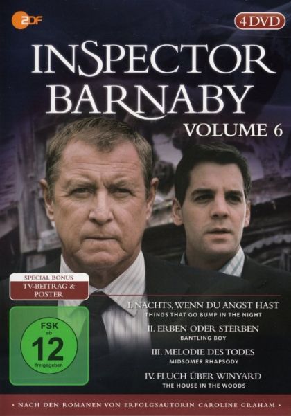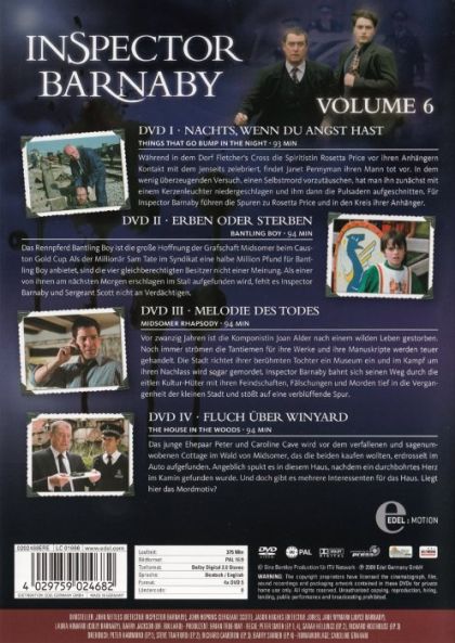 DVD I • NACHTS, WENN DU ANGST HASTThings That Go Bump in the Night • 93 minWährend in dem Dorf Fletcher's Cross die Spiritistin Rosetta Price vor ihren Anhängern Kontakt mit dem Jenseits zelebriert, findet Janet Pennyman ihren Mann tot vor. In dem wenig überzeugenden Versuch, einen Selbstmord vorzutäuschen, hat man ihn zunächst mit einem Kerzenleuchter niedergeschlagen und ihm dann die Pulsadern aufgeschnitten. Für Inspector Barnaby führen die Spuren zu Rosetta Price und in den Kreis ihrer Anhänger.DVD II • ERBEN ODER STERBENBantling Boy • 94 minDas Rennpferd Bantling Boy ist die große Hoffnung der Grafschaft Midsomer beim Causton Gold Cup. Al der Millionär Sam Tate im Syndikat eine halbe Million Pfund für Bantling Boy anbietet, sind die vier gleichberechtigten Besitzer nicht einer Meinung. Als einer von ihnen am nächsten Morgen erschlagen im Stall aufgefunden wird, fehlt es Inspector Barnaby und Sergeant Scott nicht an Verdächtigen.DVD III • MELODIE DES TODESMidsomer Rhapsody • 94 minVor zwanzig Jahren ist die Komponistin Joan Alder nach einem wilden Leben gestorben. Noch immer strömen die Tantiemen für ihre Werke und ihre Manuskripte werden teuer gehandelt. Die Stadt richtet ihrer berühmten Tochter ein Museum ein und im Kampf um ihren Nachlass wird sogar gemordet. Inspector Barnaby bahnt sich seinen Weg durch die eitlen Kultur-Hüter mit ihren Feindschaften, Fälschungen und Morden tief in die Vergangenheit der kleinen Stadt und stößt auf eine verblüffende Spur.DVD IV • FLUCH ÜBER WINYARDThe House in the Woods • 94 minDas junge Ehepaar Peter und Caroline Cave wird von dem verfallenen und sagenumwobenen Cottage im Wald von Midsomer, das die beiden kaufen wollten, erdrosselt im Auto aufgefunden. Angeblich spukt es in diesem Haus, nachdem ein durchbohrtes Herz im Kamin gefunden wurde. Und doch gibt es mehrere Interessenten für das Haus. Liegt hier das Mordmotiv?