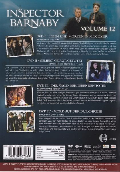 DVD I • LEBEN UND MORDEN IN MIDSOMERMidsomer Life • 93 MinTouristen entdecken die halb verweste Leiche von Charlie Finleyson im Wald. Früher lebte er in Midsomer, bis er mit Guy Sandys Ehefrau Christine durchbrannte. Kurze Zeit später wird Guy in seinem Büro erstochen. Ein Motiv hätten viele, denn mit seinem scharfzüngigen Magazin „Midsomer Life“ hatte er sich viele Feinde gemacht. Barnaby und Jones treffen nur auf einen einzigen Menschen, der ihn offensichtlich mochte - seine Mitarbeiterin Julia Benson.DVD II • GELIEBT, GEJAGT, GETÖTETDeath in a Chocolate Box • 93 MinJack Colby wird tot im Wald gefunden - erschlagen mit einem schweren Gegenstand. Er und seine Frau Gina hatten vor vielen Jahren den Polizeidienst quittiert, nachdem der Ort Causton von einem Sex-Skandal und dem Mord an Lady Holm erschüttert worden war. Kurz nachdem Barnaby und Jones mit ihren Ermittlungen begonnen haben, geschieht ein weiterer Mord. Die Mordwaffe: die eiserne Kurbel einer Camera Obscura - dieselbe wie damals bei Lady Holm.DVD III • DER WALD DER LEBENDEN TOTENThe Magician's Nephew • 93 MinAloysius, der Besitzer einer riesigen Bibliothek, gibt Zaubervorstellungen für Kinder. Plötzlich liegt seine Assistentin tot auf der Bühne. Durch Stichwunden war ein exotisches Gift in ihre Blutbahn gelang. Auch ein Antiquar wird Opfer dieses Giftes. Barnaby glaubt nicht an einen Zufall. Doch was steckt hinter den beiden Morden? Besteht ein Zusammenhang mit Aloysius' mystischer Vergangenheit um einen keltischen Tempel?DVD IV • MORD AUF DER DURCHREISEBlood will out • 100 MinZwei Gruppen von fahrendem Volk drohen den Frieden in der Grafschaft Midsomer zu sprengen. Zwar darf Peter Fairfax mit seinen Leuten auf dem riesigen Grundstück seines alten Freundes Will Saxby campieren, aber die Mehrheit im Dorf ist erbost über die "Belagerung", allen voran Herrenhaus-Besitzer Hector Bridges. Die Atmosphäre wird immer feindseliger und eines Abends wird Bridges mit seiner eigenen Schrotflinte erschossen aufgefunden.