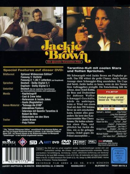 Tarantino-Kult mit coolen Stars und flotten Sprüchen.Mit Schwarzgeld wird Jackie Brown am Flughafen gestellt. Das FBI wittert die große Chance, durch Jackies Aussage einen Schmuggler-Ring auszuheben. Die Cops sind bereit, Jackie laufen zu lassen, wenn sie den Namen ihres Auftraggebers preisgibt. Die Entscheidung fällt ihr schwer, denn Ordell Robbie, ihr Boss und Drahtzieher der dubiosen Waffen-Schmuggel-Geschäfte, würde sie umbringen, wenn er Wind von einem Deal mit dem FBI bekäme. Bevor sie sich entscheiden kann, kommt alles ganz anders: Sie lernt den Kautionsvermittler Max Cherry kennen. Die beiden schmieden einen Plan, und plötzlich hat Jackie die Idee, wie es ihr gelingen könnte, Ordell gegen die Polizei auszuspielen ...