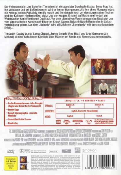 Der Videospezialist Joe Scheffer (Tim Allen) ist ein absoluter Durchschnittstyp: Seine Frau hat ihn verlassen und bei Beförderungen wird er immer übergangen. Als ihm eines Morgens jedoch ein Kollege seinen Parkplatz streitig macht und ihn danach noch vor den Augen seiner Tochter und der Kollegen niederschlägt, platzt Joe der Kragen. Er sinnt auf Rache und fordert den Widersacher zum öffentlichen Duell auf. Vor dem ultimativen Vergeltungsschlag lässt sich Joe vom abgehalfterten Kampfsport-Experten Chuck (James Belushi) Nachhilfestunden in Selbstverteidigung geben. Aus dem „Nobody“ wird plötzlich ein „Somebody“ mit durchschlagendem Erfolg...Tim Allen (Galaxy Quest, Santa Clause), James belushi (Red Heat) und Greg Germann (Ally McBeal) in einer turbulenten Komödie über Männer am Rande des Nervenzusammenbruchs.