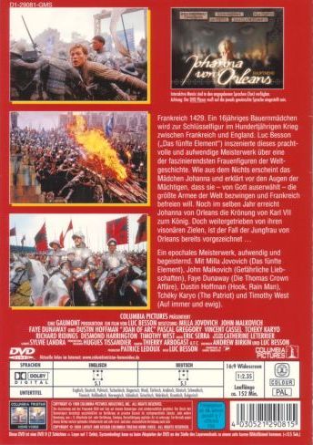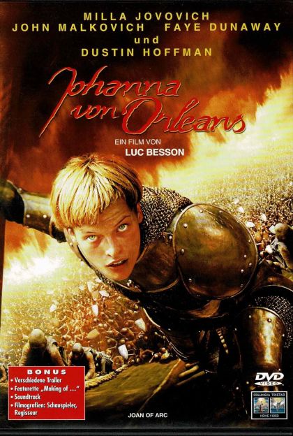 Frankreich 1429. Ein 16jähriges Bauernmädchen wird zur Schlüsselfigur im Hundertjährigen Krieg zwischen Frankreich und England. Luc Besson („Das fünfte Element“) inszenierte dieses prachtvolle und aufwendige Meisterwerk über eine der faszinierendsten Frauenfiguren der Weltgeschichte. Wie aus dem Nichts erscheint das Mädchen Johanna und erklärt vor den Augen der Mächtigen, dass sie – von Gott auserwählt – die größte Armee der Welt bezwingen und Frankreich befreien will. Noch im selben Jahr erreicht Johanna von Orleans die Krönung von Karl VII zum König. Doch weitergetrieben von ihren visionären Zielen, ist der Fall der Jungfrau von Orleans bereits vorgezeichnet ...Ein epochales Meisterwerk, aufwendig und begeisternd. Mit Milla Jovovich (Das fünfte Element), John Malkovich (Gefährliche Liebschaften), Faye Dunaway (Die Thomas Crown Affäre), Dustin Hoffman (Hook, Rain Man), Tchéky Karyo (The Patriot) und Timothy West (Auf immer und ewig).