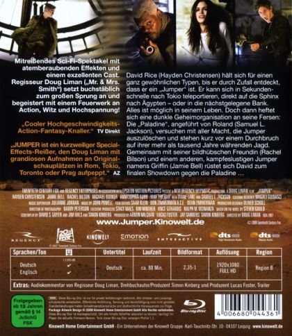 'Mitreißendes Sci-Fi-Spektakel mit atemberaubenden Effekten und einem exzellenten Cast. Regisseur Doug Liman ("Mr. & Mrs. Smith") setzt buchstäblich zum großen Sprung an und begeistert mit einem Feuerwerk an Action, Witz und Hochspannung!'David Rice (Hayden Christensen) hält sich für einen ganz gewöhnlicher Typ, bis er durch Zufall entdeckt, dass er ein "Jumper" ist. Er kann sich in Sekundenschnelle nach Tokio teleportieren, direkt auf die Sphinx nach Ägypten - oder in die nächstgelegene Bank. Alles ist möglich in seinem Leben. Doch dann heftet sich eine dunkle Geheimorganisation an seine Fersen: Die "Paladine", angeführt von Roland (Samuel L. Jackson), versuchen mit aller Macht, die Jumper auszulöschen und stehen kurz vor einem Durchbruch auf ihrer mehr als tausend Jahre währenden Jagd. Gemeinsam mit seiner bildhübschen Freundin (Rachel Bilson) und einem anderen, kampfeslustigen Jumper namens Griffin (Jamie Bell) rüstet sich David zum finalen Showdown gegen die Paladine ...