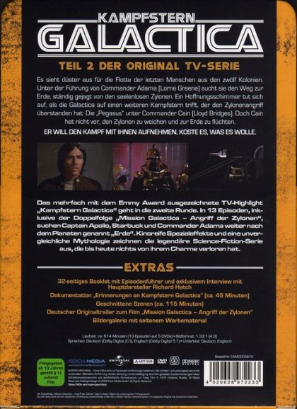 Es sieht düster aus für die Flotte der letzten Menschen aus den zwölf Kolonien. Unter der Führung von Commander Adama (Lorne Greene) sucht sie den Weg zur Erde, ständig gejagt von den bösartigen Zylonen. Ein Hoffnungsschimmer tut sich auf, als die Galactica auf einen weiteren Kampfstern trifft, der den Zylonenangriff überlebt hat - die Pegasus unter Commander Cain (Lloyd Bridges). Doch Cain hat nicht vor, den Zylonen zu weichen und zur Erde zu flüchten.ER WILL DEN KAMPF MIT IHNEN AUFNEHMEN, KOSTE ES, WAS ES WOLLE.Das mehrfach mit dem Emmy Award ausgezeichnete TV-Highlight "Kampfstern Galactica" geht in die zweite Runde. In 13 Episoden, inklusive der Doppelfolge "Mission Galactica - Angriff der Zylonen", suchen Captain Apollo, Starbuck und Commander Adama weiter nach dem Planeten genannt "Erde". Kinoreife Spezialeffekte und eine unvergleichliche Mythologie zeichnen die legendäre Science-Fiction-Serie aus, die bis heute nichts von ihrem Charme verloren hat.