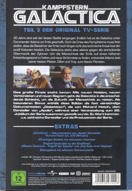 30 Jahre sind seit der letzten Staffel vergangen: Endlich hat es die Galactica unter Commander Adama zur Erde geschafft. Doch die Crew des Kampfsterns muss feststellen, dass die Bewohner der Erde noch längst nicht das technische Know-how der zwölf Kolonien besitzt. Die Galactica steht also alleine gegen die anrückende Übermacht der Zylonen. Um die Menschheit der Erde auf einen höheren Entwicklungsstand zu heben und neue Verbündete zu finden, entsendet Adama zwei seiner besten Piloten, Dillon und Troy, zum blauen Planeten. DVD 1: Episode 25 - Erforschung der Erde Episode 26 - Gefahr für die Menschheit Episode 27 - Der Machtkampf Bonus: - Bildergalerien, Trailer DVD 2: Episode 28 - Rettung der Kinder, Teil 1 Episode 29 - Rettung der Kinder, Teil 2 Episode 30 - Die Erpressung DVD 3: Episode 31 - Die Landung der Zylonen Episode 32 - Hetzjagd durch New York Episode 33 - Neue Partner Episode 34 - Das Gemeimnis um Starbuck DVD 4: Special - Galacticon