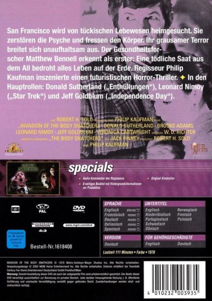 San Francisco wird von tückischen Lebewesen heimgesucht. Sie zerstören die Psyche und fressen den Körper. Ihr grausamer Terror breitet sich unaufhaltsam aus. Der Gesundheitsforscher Matthew Bennell erkennt als erster: Eine tödliche Saat aus dem All bedroht alles Leben auf der Erde. Regisseur Philip Kaufman inszenierte einen futuristischen Horror-Thriller.In den Hauptrollen: Donald Sutherland ("Enthüllungen"), Leonard Nimoy ("Star Trek") und Jeff Goldblum ("Independence Day").