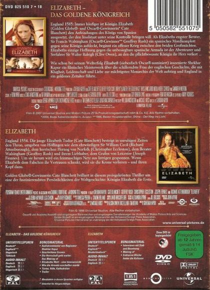 ELIZABETH - DAS GOLDENE KÖNIGREICHEngland 1585: Immer häufiger ist Königin Elizabeth (Golden Globe- und Oscar-Gewinnerin Cate Blanchett) den Anfeindungen des Königs von Spanien ausgesetzt, der den Inselstaat unter seine Kontrolle bringen will. Als Elizabeths engster Berater, Sir Francis Walsingham (Oscar-Gewinner Geoffrey Rush) ein spanisches Mordkomplott gegen seine Königin aufdeckt, beginnt ein offener Krieg zwischen den beiden Großmächten. Elizabeths einzige Hoffnung gegen die unbesiegbare spanische Armada ist der Abenteurer und Seefahrer Sir Walter Raleigh (Clive Owen), an den die pflichtbewusste Königin ihr Herz verliert...Wie schon bei seinem Welterfolg Elizabeth (siebenfach Oscar@-nominiert) inszenierte Shekhar Kapur ein filmisches Meisterwerk über die schillerndste Frau der englischen Geschichte, die mit Klugheit, Leidenschaft und Liebe zur mächtigsten Monarchin der Welt aufstieg und England in ein goldenes Zeitalter führte.ELIZABETHEngland 1554. Die junge Elizabeth Tudor (Cate Blanchett) besteigt in unruhigen Zeiten den Thron, umgeben von Höflingen wie dem ehrwürdigen Sir William Cecil (Richard Attenborough), dem herrischen Herzog von Norfolk (Christopher Eccleston), dem Berater Walsingham (Geoffrey Rush) und ihrem Liebhaber, dem Grafen von Leicester (Joseph Fiennes). Um sie herum wird ein feinmaschiges Netz aus Intrigen gesponnen. Wenn Elizabeth dem Falschen ihr Vertrauen schenkt, wird sie die Krone verlieren - und ihren Kopf dazu.Golden Globe-Gewinnerin Cate Blanchett brilliert in diesem preisgekrönten Thriller um eine der faszinierendsten Persönlichkeiten der Weltgeschichte: Königin Elizabeth die Erste.