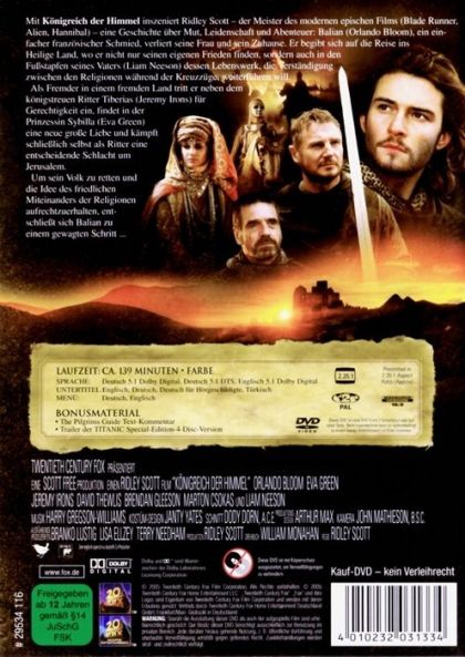 Mit Königreich der Himmel inszeniert Ridley Scott - der Meister des modernen epischen Films (Blade Runner, Alien, Hannibal) - eine Geschichte über Mut, Leidenschaft und Abenteuer: Balian (Orlando Bloom), ein einfacher französischer Schmied, verliert seine Frau und sein zu Hause. Er begibt sich auf die Reise ins Heilige Land, wo er nicht nur seinen eigenen Frieden finden, sondern auch in den Fußstapfen seines Vaters (Liam Neeson) dessen Lebenswerk, die Verständigung zwischen den Religionen, während der Kreuzzüge weiterführen will.Als Fremder in einem fremden Land tritt er neben dem königstreuen Ritter Tiberias (Jeremy Irons) für Gerechtigkeit ein, findet in der Prinzessin Sybilla (Eva Green) eine neue große Liebe und kämpft schließlich selbst als Ritter eine entscheidende Schlacht um Jerusalem.Um sein Volk zu retten und die Idee des friedlichen Miteinanders der Religionen aufrecht zu erhalten, entschließt sich Balian zu einem gewagten Schritt ...