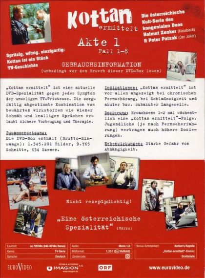 "Kottan ermittelt" ist eine aktuelle DVD-Spezialität gegen jedes Symptom der unseligen TV-Tristesse. Die sorgfältig abgestimmte Kombination von bewährten Wirkstoffen wie Wiener Schmäh und knalligen Sprüchen erlauben sichere Vorbeugung und Therapie.'Zusammensetzung:'Die DVD-Box enthält (Brutto-Einwaage): 1.345.201 Bilder, 9.765 Schnitte, 634 Szenen. 'Indikationen:' "Kottan ermittelt" ist vor allem angezeigt bei chronischem Fernsehdrang, bei Schlaflosigkeit und akuter bzw. subakuter Langeweile. 'Dosierung:' Erwachsene: 1-2 mal wöchentlich eine "Kottan ermittelt"-Folge. Jugendliche (je nach Fernseherfahrung) vertragen auch höhere Dosierungen. 'Nebenwirkungen:' Starke Gefahr von Abhängigkeit.