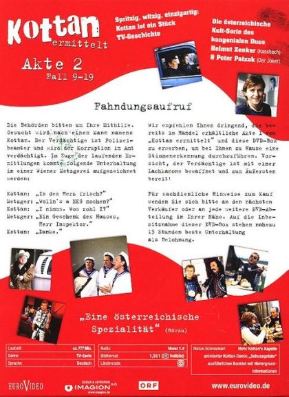 Die Behörden bitten um Ihre Mithilfe. Gesucht wird nach einem Mann namens Kottan. Der Verdächtige ist Polizeibeamter und wird der Korruption im Amt verdächtigt. Im Zuge der laufenden Ermittlungen konnte folgende Unterhaltung in einer Wiener Metzgerei aufgezeichnet werden:Kottan: "Is des Herz frisch?"Metzger: "Wolln`s a EKG mochen?"Kottan: "I nimms. Wos zohl I?"Metzger: "Ein Geschenk des Hauses, Herr Inspektor."Kottn: "Danke."Wir empfehlen Ihnen dringend, die bereits im Handel erhältliche Akte 1 von "Kottan ermittelt" und diese DVD-Box zu erwerben, um bei Ihnen zu Hause eine Stimmenerkennung durchzuführen. Vorsicht, der Verdächtige ist mit einer Lachkanone bewaffnet und zu Äußersten bereit!Für sachdienliche Hinweise zum Kauf wenden Sie sich bitte an den nächsten Verkäufer oder an jede weitere DVD-Abteilung in Ihrer Nähe. Auf die Inbesitznahme dieser DVD-Box stehen nahezu 13 Stunden beste Unterhaltung als Belohnung.