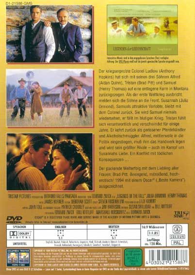 Der kriegserprobte Colonel Ludlow (Anthony Hopkins) hat sich mit seinen drei Söhnen Alfred (Aidan Quinn), Tristan (Brad Pitt) und Samuel (Henry Thomas) auf eine entlegene Farm in Montana zurückgezogen. Als der erste Weltkrieg ausbricht, melden sich die Söhne an die Front. Susannah (Julia Ormond), Samuels attraktive Verlobte, bleibt mit dem Colonel zurück. Sie wird Samuel nie wieder sehen, er fällt im blutigen Krieg. Tristan fühlt sich verantwortlich und verschwindet für einige Jahre. Er kehrt zurück als gerissener Pferdehändler und Alkoholschmuggler. Alfred, mittlerweile in die Politik eingestiegen, muß ihm das Handwerk legen und wird sein größter Rivale- auch im Kampf um Susannahs Liebe. Ein Konflikt mit tödlichen Konsequenzen... Der packende Welterfolg mit dem Liebling aller Frauen: Brad Pitt. Bewegend, mitreisend, hocherotisch! 1994 mit dem Oscar (Beste Kamera) ausgezeichnet.