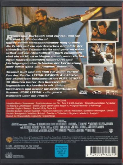 Riggs und Murtaugh sind zurück, und sie sind in Bombenform!Hinter einem Menschenhändler-Ring stoßen die Profis auf ein mörderisches Komplott der chinesischen Triaden-Mafia und geraten dabei selbst auf die Abschußliste. Doch zusammen sind sie nicht zu schlagen - auch wenn sie bei ihren haarsträubenden Shoot-Outs und Verfolgungen eine Schneise der Verwüstung quer durch ganz Los Angeles ziehen...Absolut Kult und ein Muß für jeden echten Fan der Profis: LETHAL WEAPON 4 inklusive der explosiven Dokumentation PURE LETHAL. 30 Minuten hinter den Kulissen der legendären Action-Serie mit vielen Interviews und bisher unveröffentlichten Szenen. PURE LETHAL - die ganze Wahrheit über die Profis!
