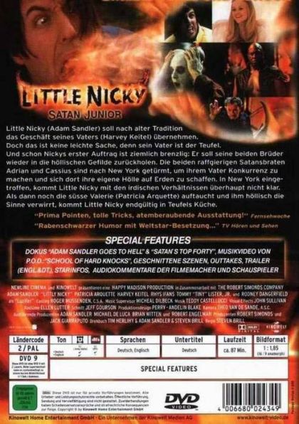 Little Nicky (ADAM SANDLER) - Er sieht nicht nur aus wie ein Trottel. Nicht so schlimm, wenn Nicky nicht der Sohn des Teufels (HARVEY KEITEL) wäre. Nickys Brüder Cassius (TINY LISTER) und Adrian (RHYS IFANS) sind ganz anders geraten. Beide sind ganz heiß darauf, den Menschen zu zeigen, was die wahre Hölle ist. Als die Beiden abhauen, um in New York schon mal die Herrschaft vorzubereiten, droht die Hölle einzufrieren. Was tun? Nicky wird beauftragt, die Teufelskerle zurückzuholen. Doch in New York sind Nickys Brüder schon voll dabei, die Stadt in die Sünde zu führen - Nicky steht vor einem Haufen Probleme. Sein kluger Begleiter ist die sprechende Bulldogge Mr. Beefy, seines Zeichens Höllenhund. Doch richtig kompliziert wird die Sache erst, als Little Nicky sich in die schüchterne Studentin Valerie (PATRICIA ARQUETTE) verliebt. Und schließlich erfährt er auch noch, wer seine wirkliche Mutter ist - wahrhaft himmlisch...