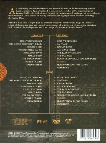 An enchanting musical perfomance, set beneath the stars in the breathtaking Moorish heart of medieval Spain. Captured in concert in September 2006, singer/composer Loreena McKennitt leads viewers through the multi-textured landscapes of her catalogue, from traditional Celtic ballads to literary narratives and highlights from her latest recording, An Ancient MuseFilmed in rich HDTV, Nights from the Alhambra evokes the otherworldly magic of Granada's palace of dreams, the fiery and inspired performances of a stellar cast of supporting musicians and, of course, the unforgetable voice and songs of Loreena McKennitt, herself.Tracklist:1. The Mystic's Dream 2. She Moved Through The Fair 3. Stolen Child 4. The Mummers' Dance 5. Penelope's Song 6. Marco Polo 7. The Bonny Swans 8. Dante's Prayer 9. Caravanserai 10. Bonny Portmore 11. Santiago 12. Raglan Road 13. All Souls Night 14. The Lady of Shalott 15. The Old Ways 16. Never-Ending Road (Amhrán Duit) 17. Huron 'Beltane' Fire Dance 18. Cymbeline