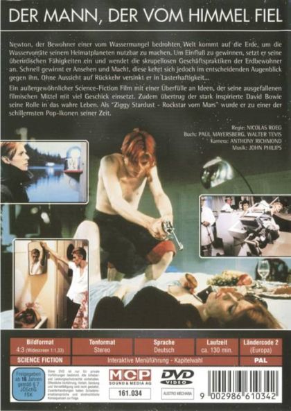 DER MANN, DER VOM HIMMEL FIELNewton, der Bewohner einer vom Wassermangel bedrohten Welt kommt auf die Erde, um die Wasservorräte seinem Heimatplaneten nutzbar zu machen. Um Einfluß zu gewinnen, setzt er seine überirdischen Fähigkeiten ein und wendet die skrupellosen Geschäftspraktiken der Erdbewohner an. Schnell gewinnt er Ansehen und Macht, diese kehrt sich jedoch im entscheidenden Augenblick gegen ihn. Ohne Aussicht auf Rückkehr versinkt er in Lasterhaftigkeit...Ein außergewöhnlicher Science-Fiction Film mit einer Überfülle an Ideen, der seine ausgefallenen filmischen Mittel mit viel Geschick einsetzt. Zudem übertrug der stark inspirierte David Bowie seine Rolle in das wahre Leben. Als 'Ziggy Stardust - Rockstar vom Mars' wurde er zu einer der schillerndsten Pop-Ikonen seiner Zeit.